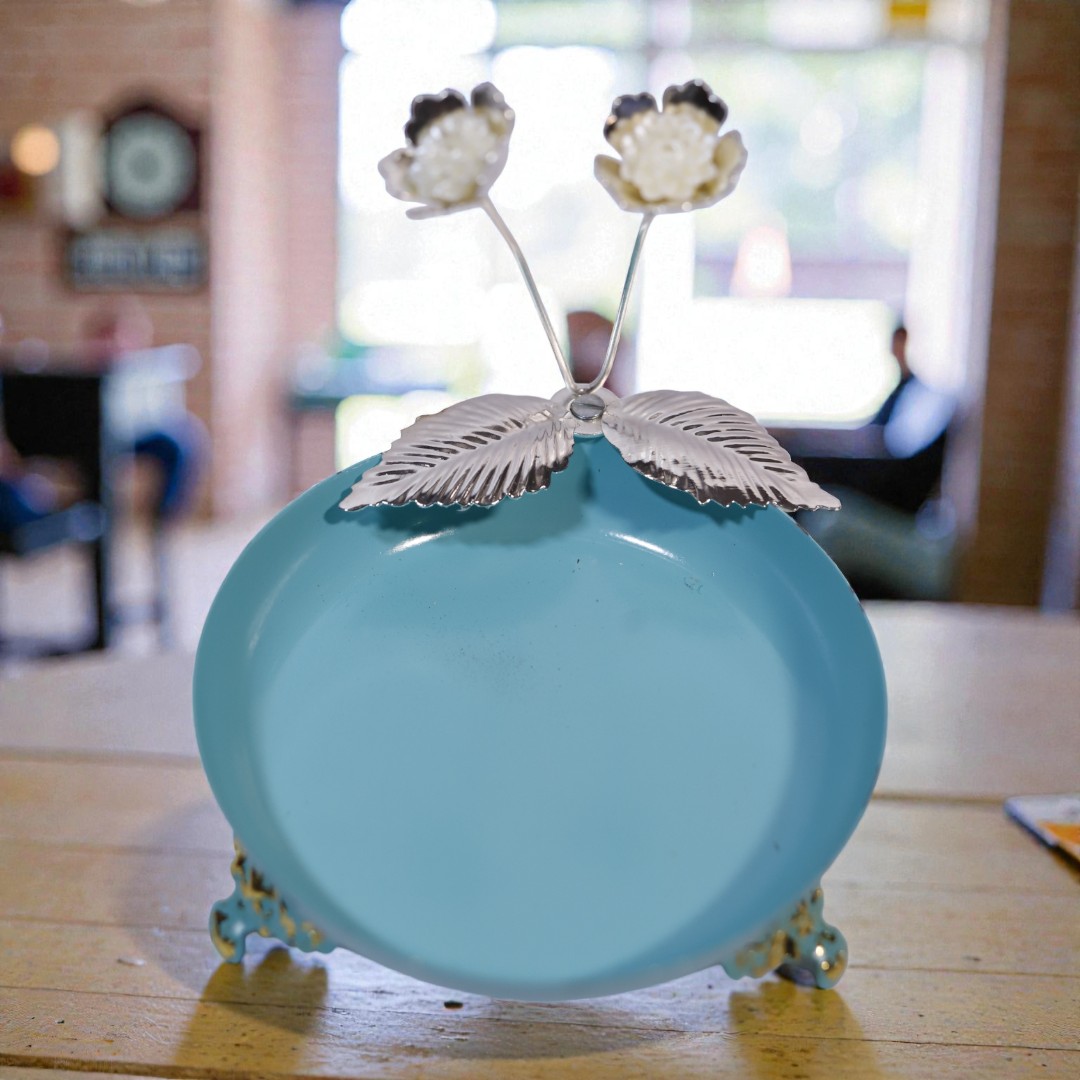 Introduce timeless elegance to your living space with the Blue Blossom Decorative Bowl, a handcrafted statement piece designed to elevate any décor setting. This stunning bowl features a smooth, matte blue finish paired with intricately sculpted silver metal leaves and dual blooming flowers rising gracefully from the rim. Each element is meticulously crafted to create a beautiful contrast of color, texture, and artistic detail.