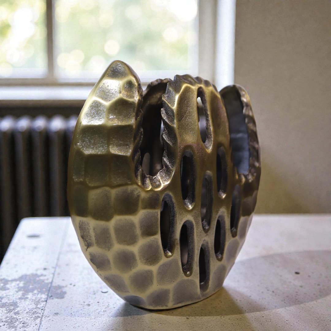 Elevate your interior with the Brass Abstract Sculptural Vase, a modern art-inspired décor piece that merges bold design with refined luxury. Crafted with meticulous attention to detail, this vase features a captivating brass finish, enriched with a hammered texture and elongated organic cutouts that create depth, dimension, and visual intrigue from every angle.