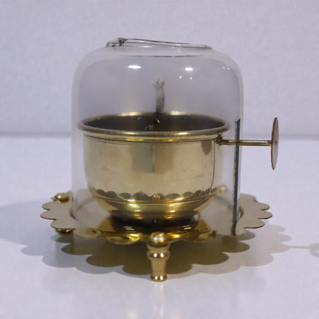 Illuminate your sacred space with this Premium Brass Wick Diya with Glass Cover, thoughtfully designed for both traditional pooja rituals and modern home décor. Hand-crafted from high-quality brass, this diya showcases a smooth polished finish, a sturdy round base, and elevated legs that ensure stability during long hours of lighting. The adjustable wick holder at the center allows you to regulate flame height effortlessly, making it ideal for daily aartis, meditation settings, or festive celebrations.