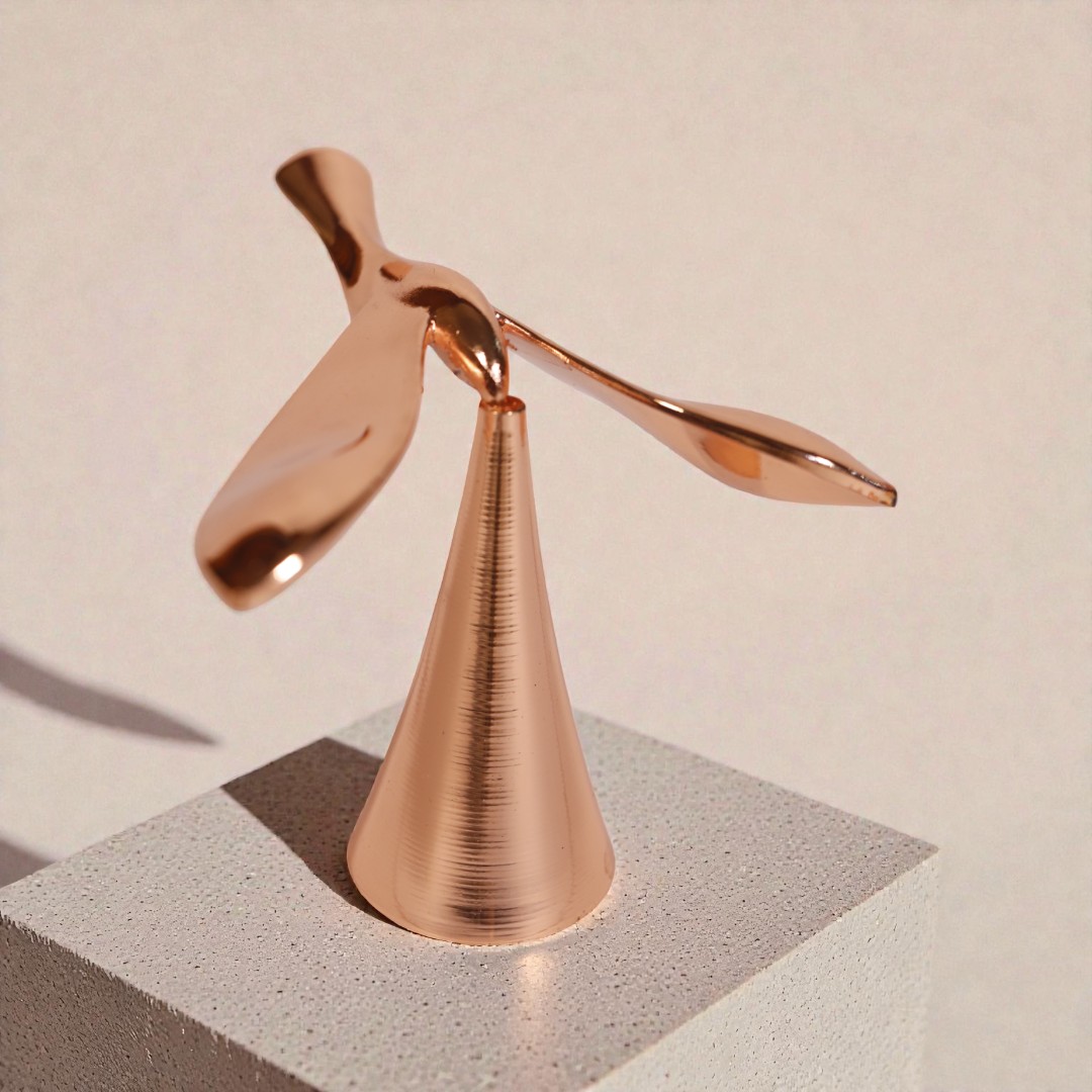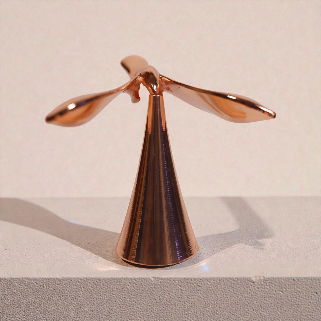 Crafted with a refined copper finish, these sculptures catch and reflect light beautifully, offering warmth and a luxurious metallic glow. Their conical bases provide stability while maintaining a sleek, modern silhouette that complements minimalist, Scandinavian, luxury, or industrial décor themes. With a gentle touch or natural airflow, each spinner rotates smoothly, transforming into a relaxing kinetic display ideal for workspaces, living rooms, study corners, creative studios, reception desks, or showcase shelves.