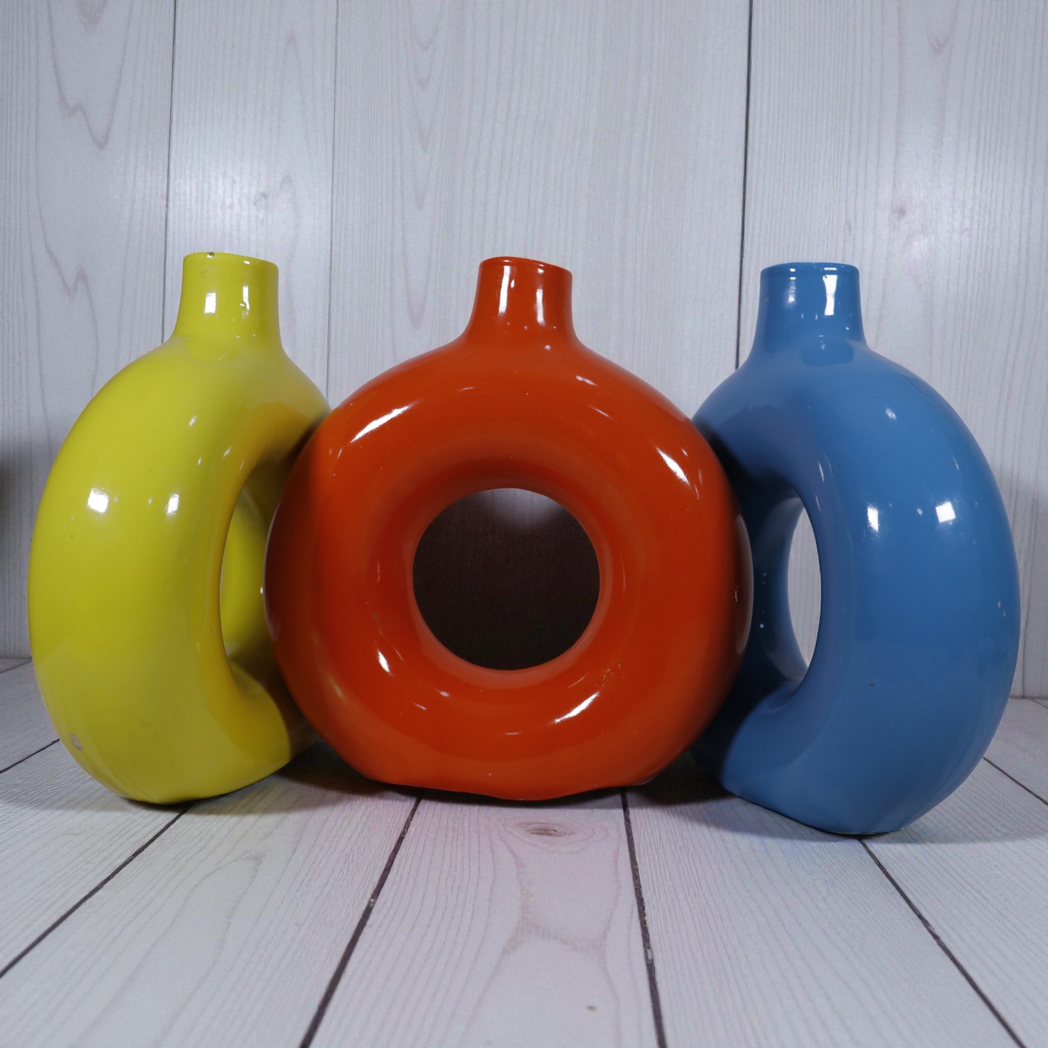 Elevate your interior styling with this Modern Donut Ceramic Vase Set, a striking collection designed for homes that celebrate creativity, color, and contemporary form. Featuring three unique vases—finished in vibrant Yellow, warm Terracotta, and soothing Sky Blue—this set reimagines modern décor through sculptural simplicity and bold expression.