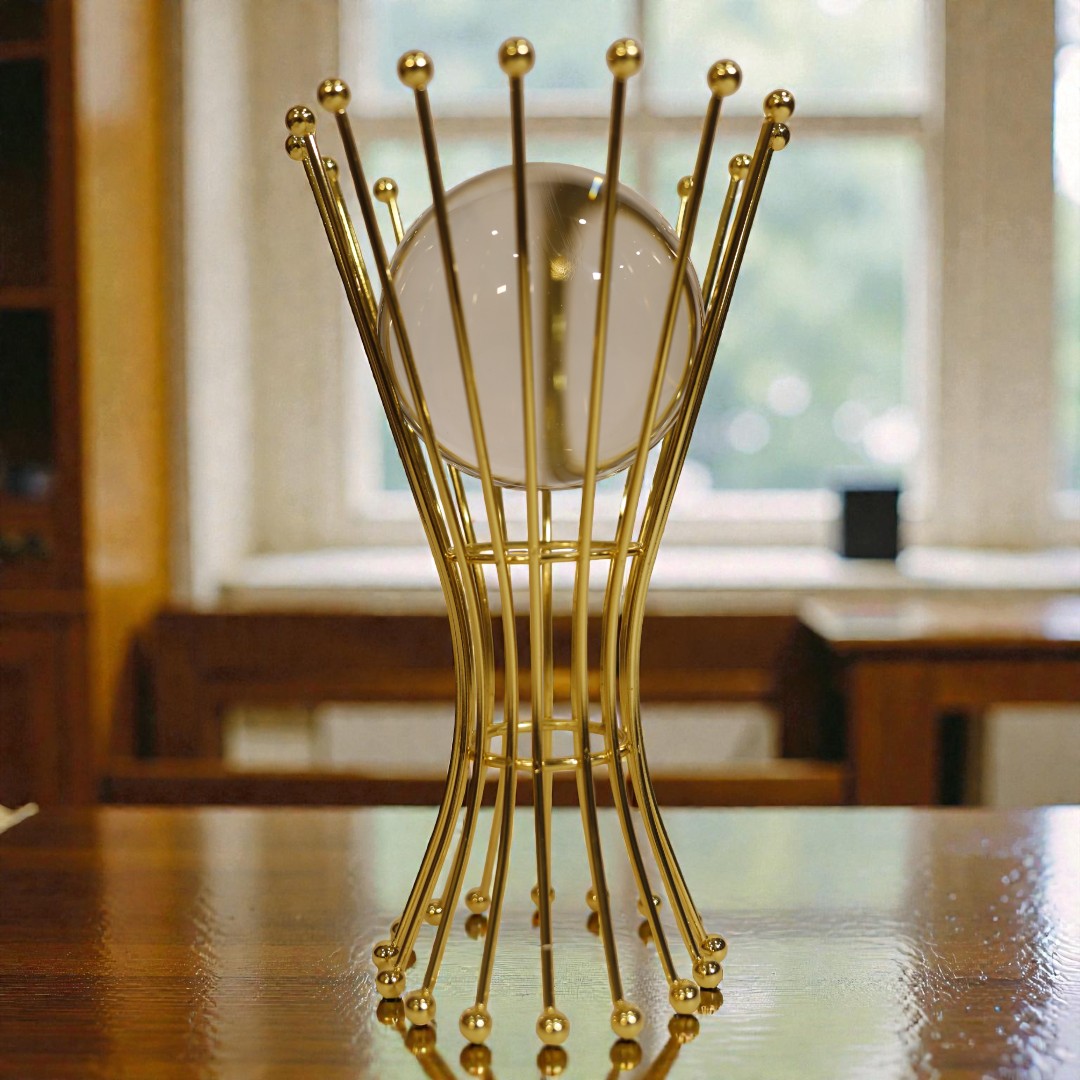 The structure stands tall with meticulously shaped rods that widen at the base for stability and narrow elegantly toward the top, creating a visually appealing hourglass silhouette. Each metal rod ends with a rounded golden bead, adding subtle charm and balance to the overall design. The crystal globe, fully removable, sits securely at the top—giving you the flexibility to display it either placed atop the stand or beside it as a decorative accent.