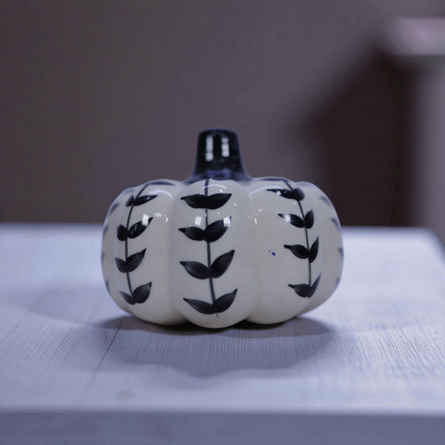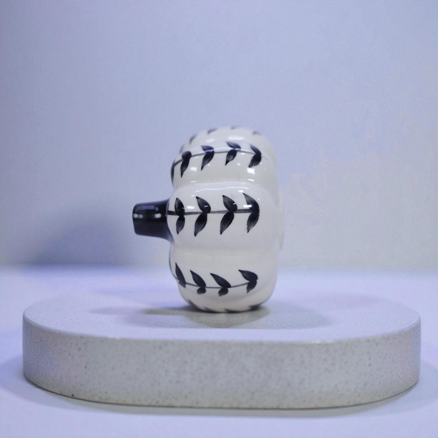 Bring a touch of refined charm to your décor with the Ivory Noir Botanical Pumpkin Vase, a beautifully crafted ceramic piece that blends artistic detail with a distinctive sculptural form. Designed in a pumpkin-inspired silhouette, this vase stands out with its rounded contours, smooth finish, and a bold narrow neck that adds height and elegance.