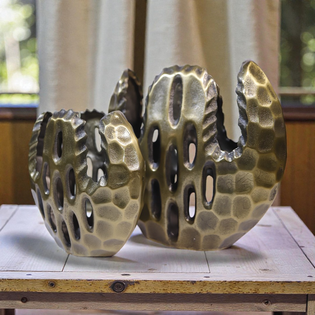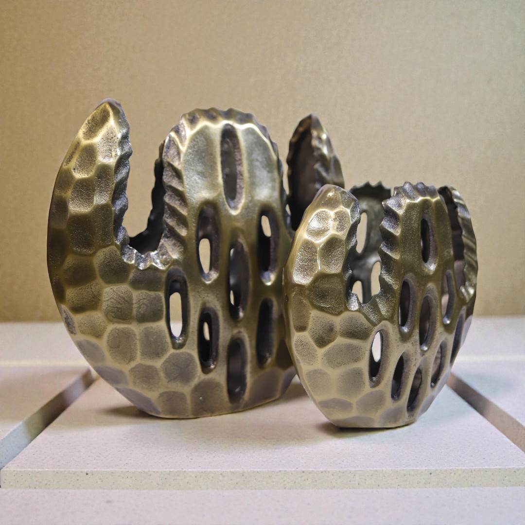 Elevate your interior styling with this Modern Gold Sculptural Vase Duo, a breathtaking combination of artistry, texture, and contemporary design. Crafted with meticulous attention to detail, each vase features a cutout abstract form inspired by organic shapes and modern sculptural aesthetics. The rich gold finish paired with hammered texture creates a luxurious look that instantly enhances any space.
