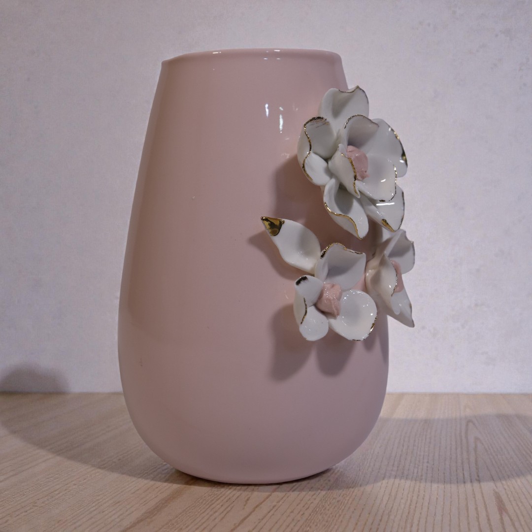 A charming pink ceramic vase adorned with hand-sculpted floral appliqués and gold detailing. Perfect for modern, romantic, or feminine décor, adding elegance to consoles, shelves, bedside tables, and gifting occasions.