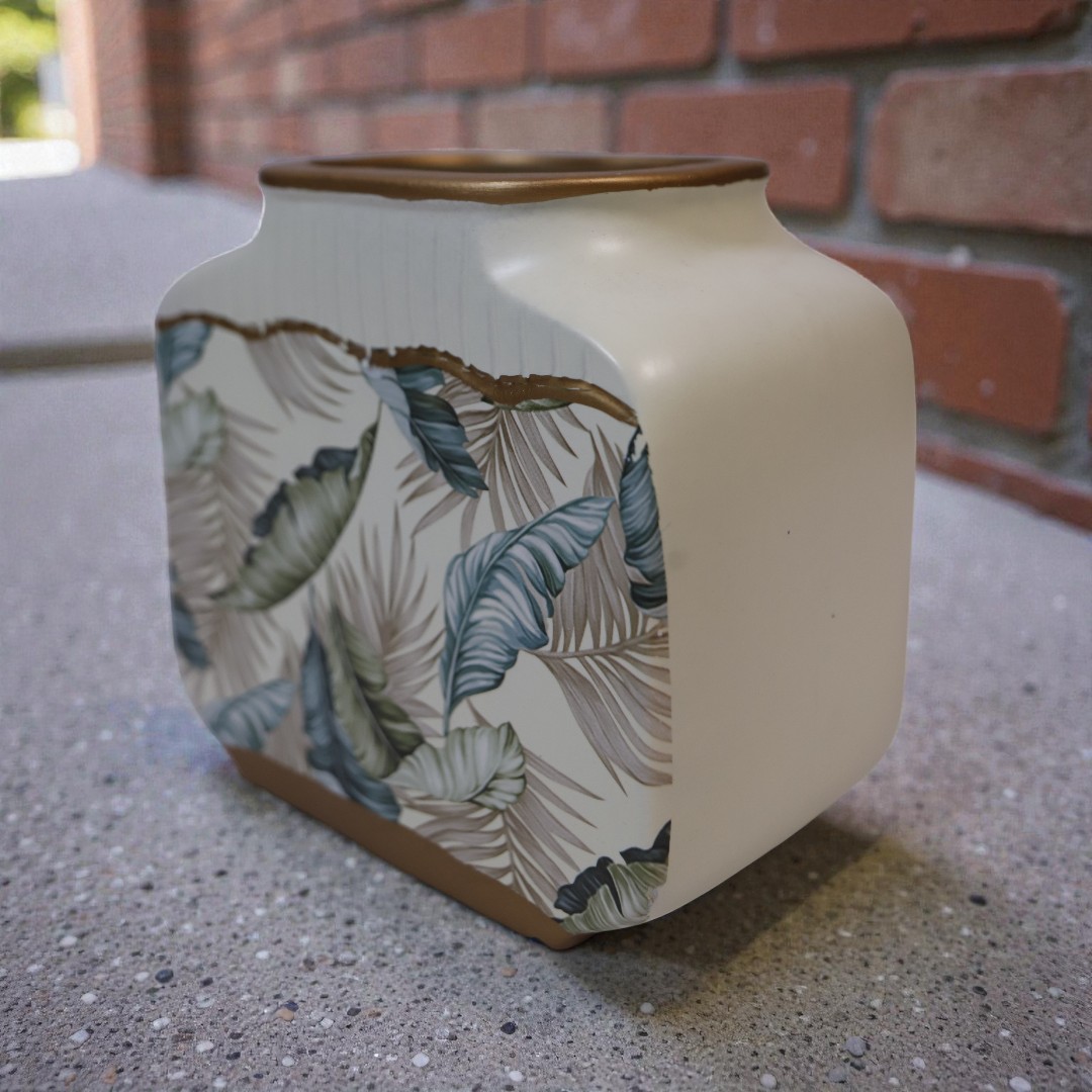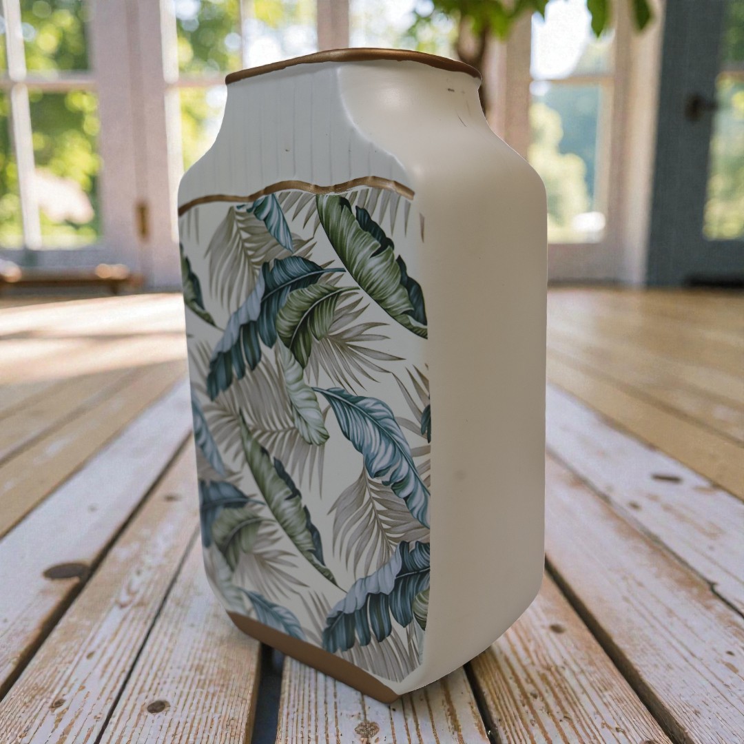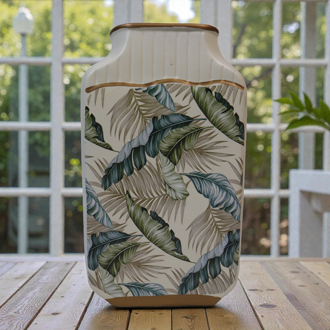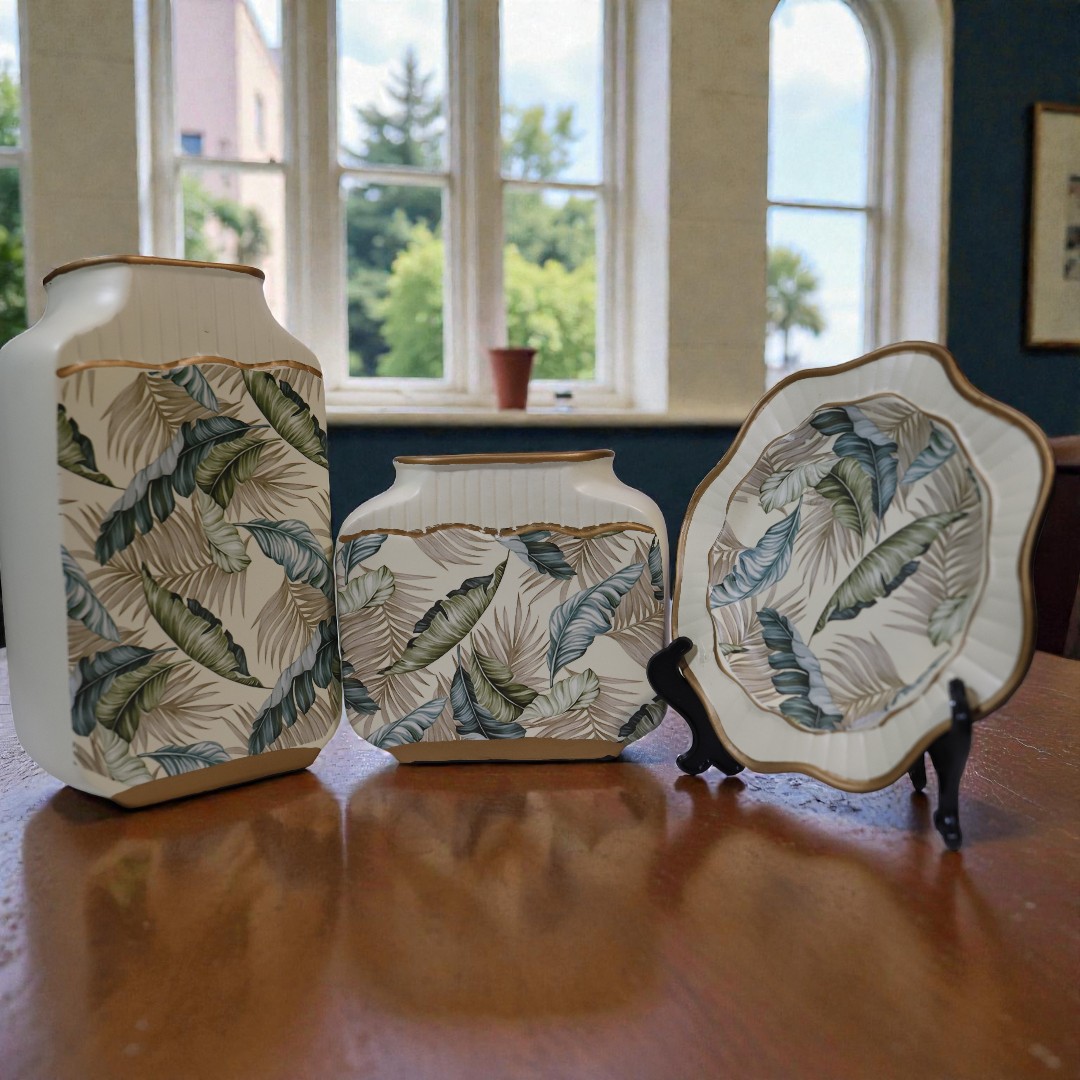 Bring the calming essence of nature into your home with this Premium Tropical Leaf Ceramic Set, a beautifully crafted ensemble designed to refresh and elevate any interior space. Featuring a tall vase, a wide rectangular vase and an elegant display plate, each piece is adorned with meticulously hand-painted tropical leaves in soft greens, muted blues, and warm beige tones. The artwork is inspired by botanical illustrations, giving the set a timeless and sophisticated aesthetic suitable for both modern and classic decor styles.