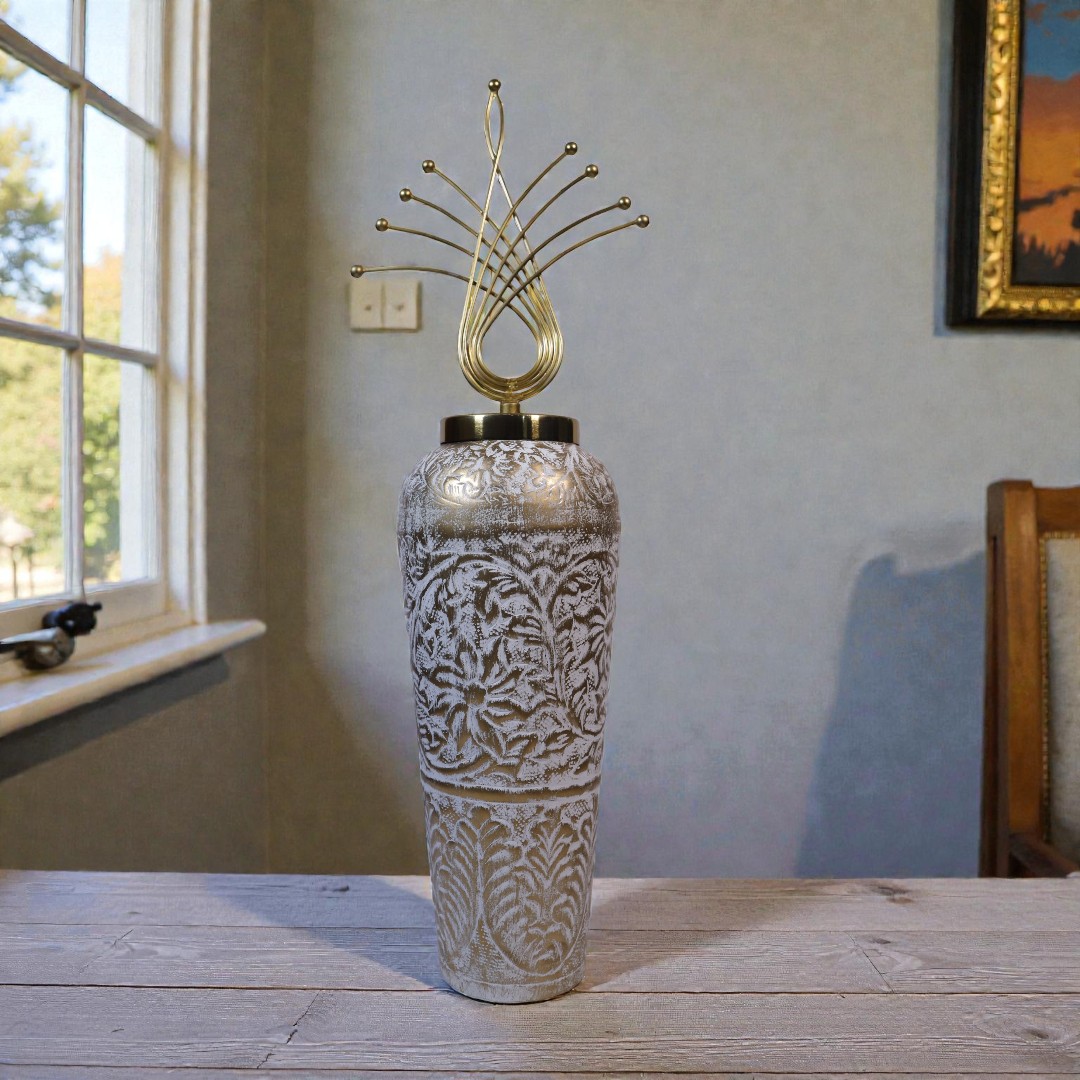 Elevate your interiors with the Regal Carved Tall Vase with Golden Crown Topper, a luxurious décor masterpiece designed for homes that appreciate artistry, heritage, and refinement. This tall ornamental vase features intricately carved antique-style patterns, finished in a distressed stone texture that adds depth, character, and timeless charm to any space. Topped with a golden sculptural crown finial, it stands as a bold statement piece that blends classic craftsmanship with modern luxury.