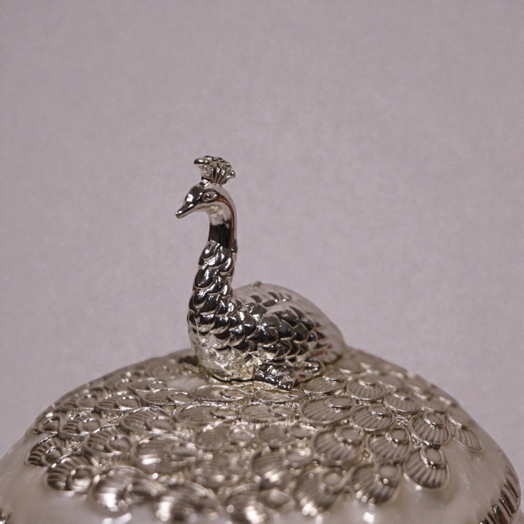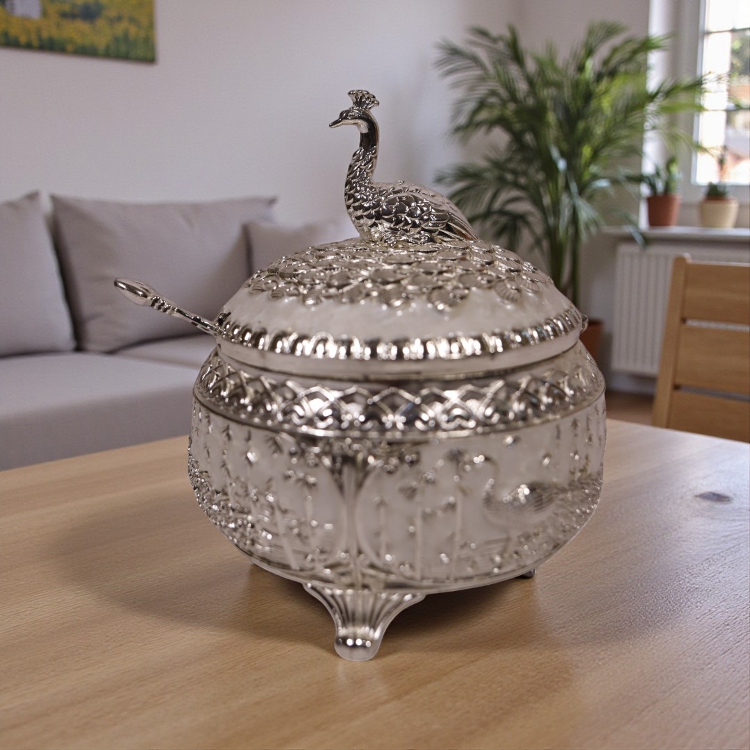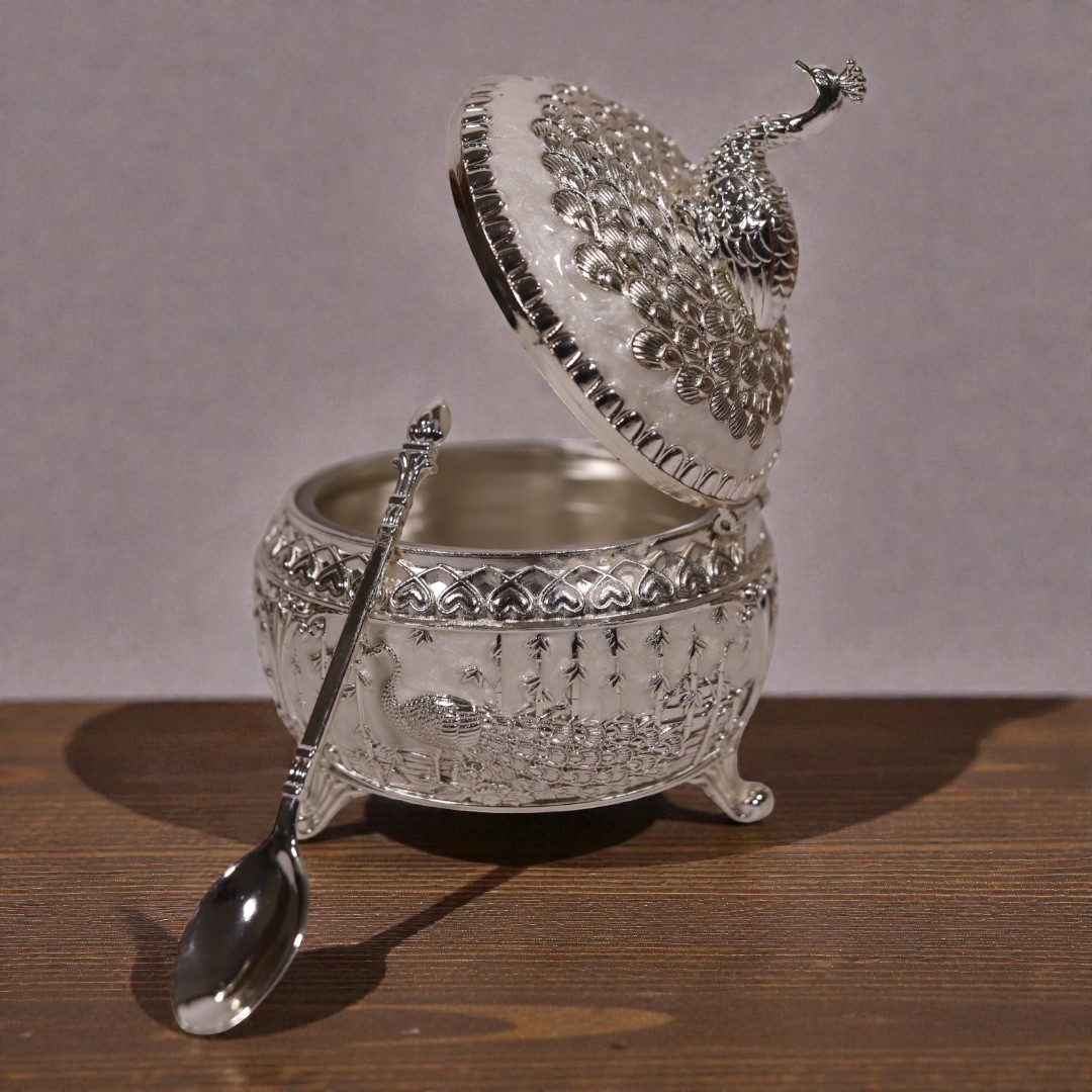 Bring home a timeless piece of functional art with this Silver Peacock Sugar Bowl, a stunning fusion of craftsmanship and elegance. Inspired by regal Indian motifs, this decorative sugar bowl features a beautifully sculpted peacock perched gracefully atop its intricately patterned lid. The fine detailing across the body showcases embossed designs, floral textures, and classic ornamental carvings that highlight its premium handcrafted finish.