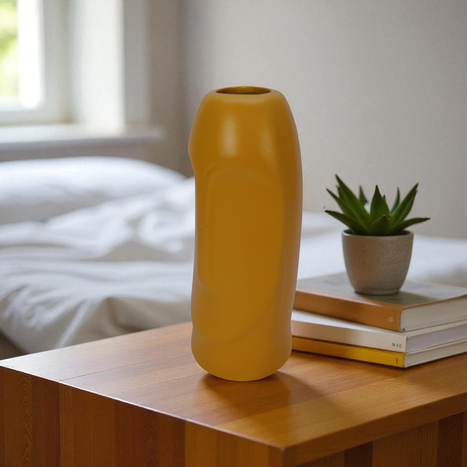 Its matte mustard-yellow finish adds a warm, earthy richness that complements modern, Scandinavian, Japandi, and minimalist décor styles. The understated texture and gentle sculptural lines create visual depth without overwhelming the space, making it an ideal accent for coffee tables, shelves, bedside stands, entry consoles, or office desks.