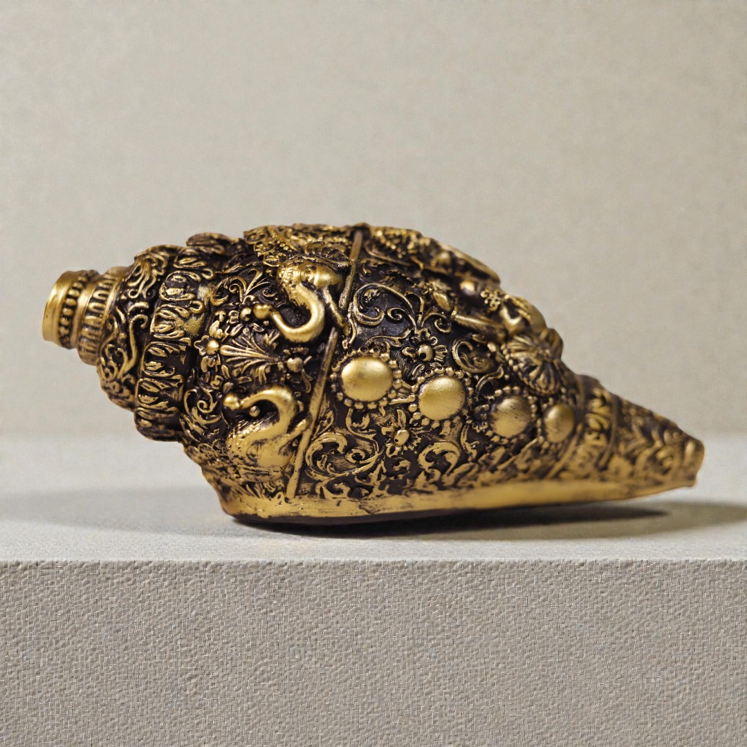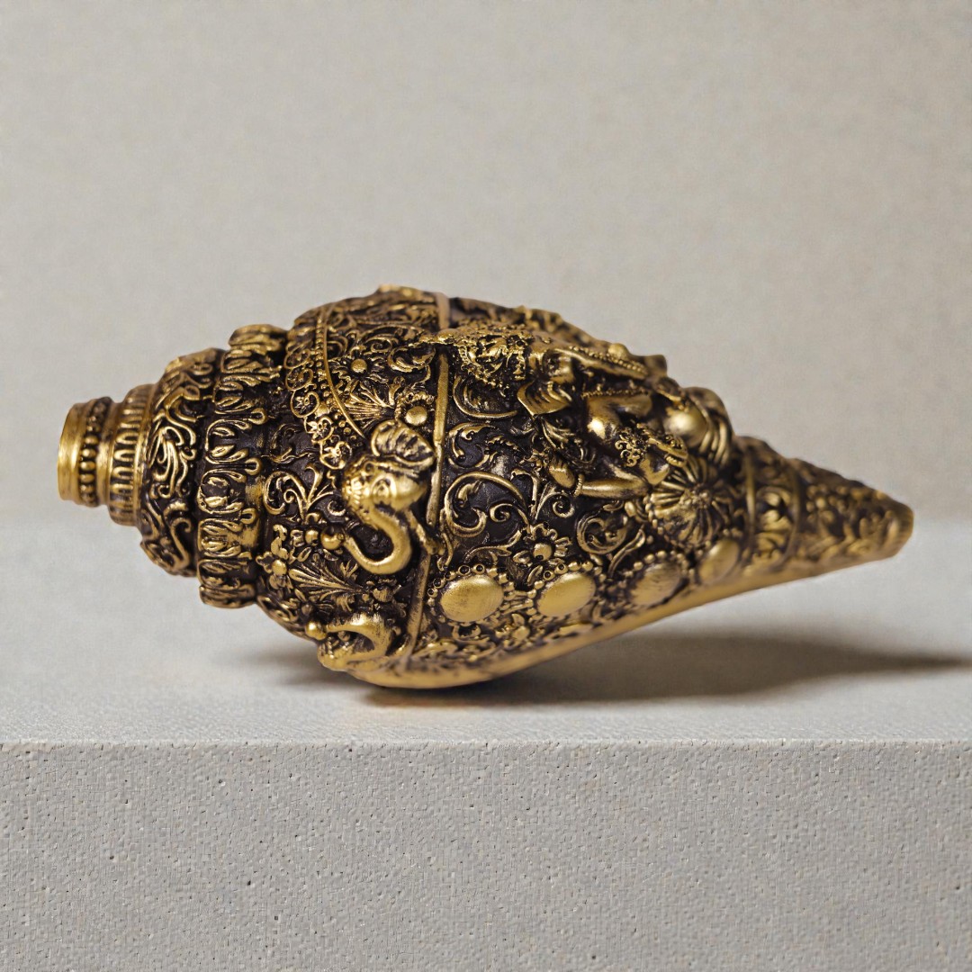 Intricately handcrafted brass shankh featuring embossed Lord Ganesh artwork. A timeless Vastu-positive home décor piece symbolizing prosperity, peace, and divine protection. Perfect for pooja rooms, gifting, and spiritual décor.