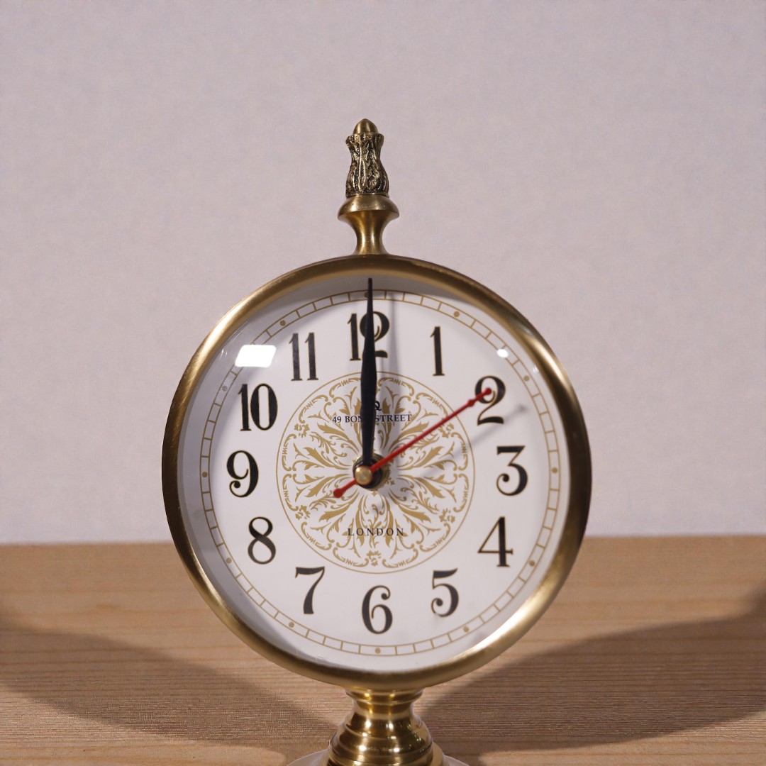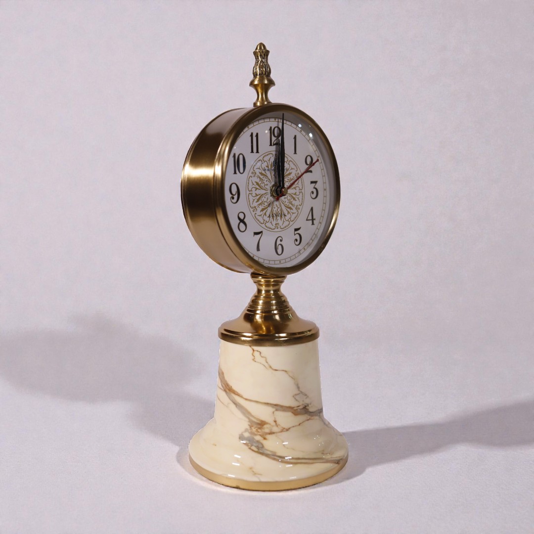 Enhance your home or office decor with this beautifully designed Vintage Marble-Base Table Clock, a perfect blend of classic elegance and modern craftsmanship. Featuring a luxurious gold-finish frame, this clock immediately captures attention with its refined detailing and timeless appeal. The round dial showcases bold black numerals, delicate ornamental patterns, and smooth sweeping hands, ensuring clear visibility while adding a sophisticated artistic touch.